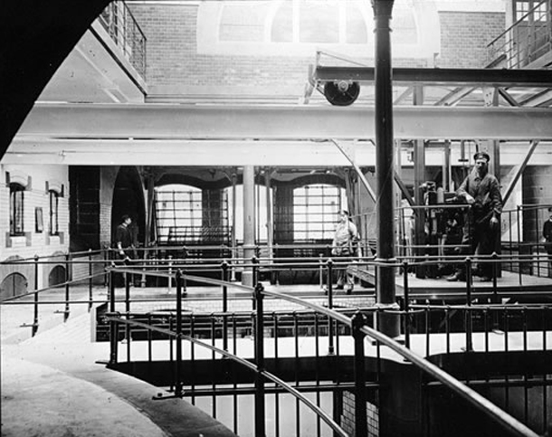 Die vier unterirdischen Absetzbecken von je 82 m Länge waren für ca. 140.000 Einwohner bemessen. Der Weg des Abwassers durch die Kläranlage begann am Sandfang.
